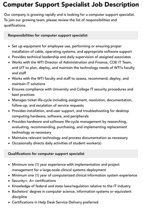 Computer Support Specialist Job Description - Learn about the job duties, education, pay, and outlook of computer support specialists, who maintain computer networks and help users. See examples of computer support specialist duties,. Find out what computer support specialist does, what skills and qualifications are required, and how to write a job description. The computer support specialist’s responsibilities include troubleshooting hardware, software, and networking issues, as.